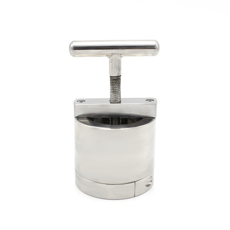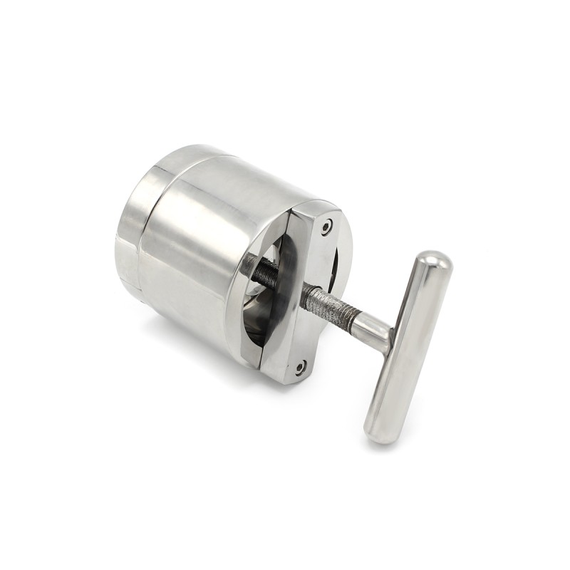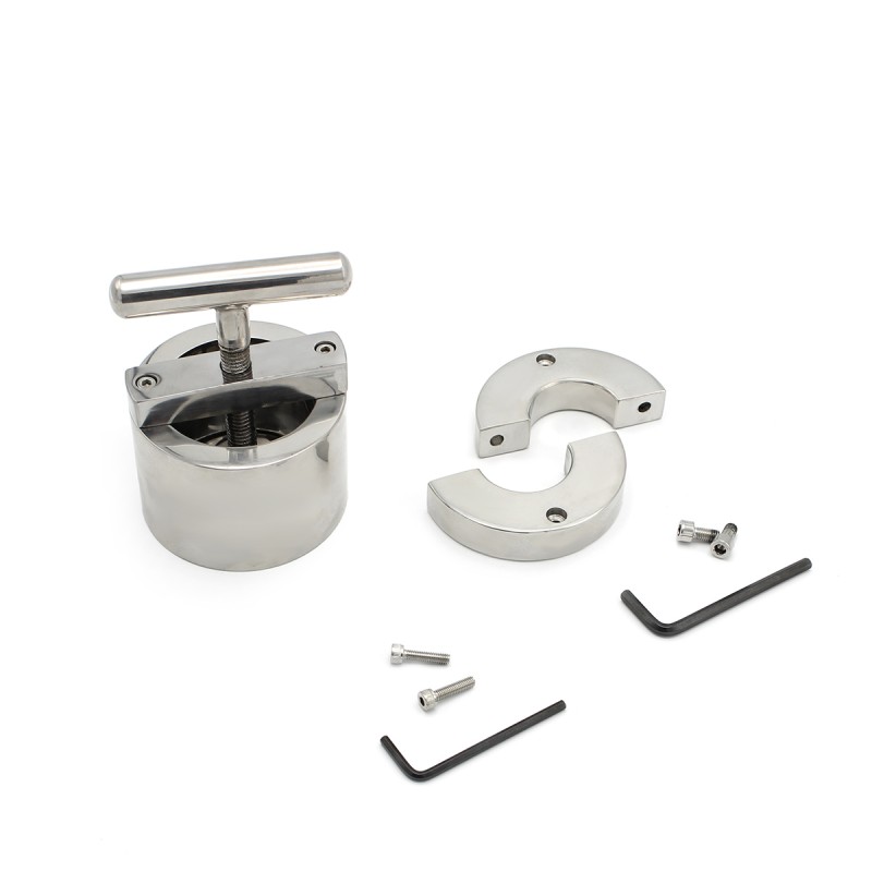 Ben je op zoek naar extreme druk op je ballen? Dan is de Ballflask Steel Crusher precies wat je nodig hebt! Met een indrukwekkend gewicht van 1,75 kg, bestaat deze krachtige tool uit twee delen voor een intense ervaring. Het eerste deel is een ballstretcher, die uit twee delen bestaat en eenvoudig om het scrotum kan worden bevestigd. Het tweede deel is een Ballflask met een Crusher-handvat, die aan de ballstretcher kan worden vastgeschroefd. Met de meegeleverde inbussleutels kun je de onderdelen vastzetten of losmaken, en door aan het handvat te draaien kun je de druk op je ballen naar wens aanpassen.