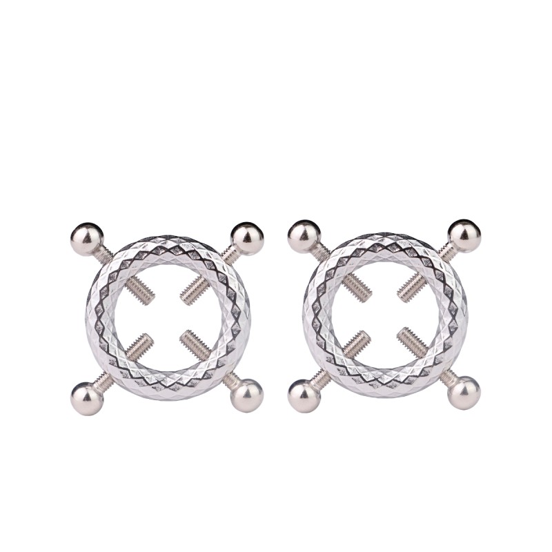 De Ronde Tepelklemmen, vervaardigd van roestvrij staal, zijn verstelbaar voor persoonlijke drukbeleving. Elke klem heeft een uniek rond ontwerp en is voorzien van belletjes voor een zintuiglijk en auditief element. De klemmen meten 8 cm lang, 7,4 cm breed en hebben een diameter van 2,6 cm, wat zorgt voor een veilige en comfortabele pasvorm.