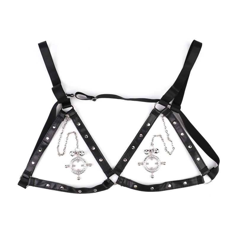 - Kenmerken: Ronde klemmen met belletjes, PU-leer harnas met open-bh ontwerp en klinknageldetails