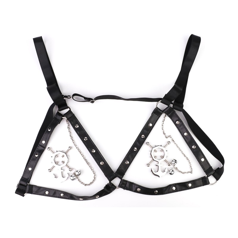 - Kenmerken: Anker-vormige klemmen met belletjes, gestudeerd PU-leer harnas met open-bh ontwerp