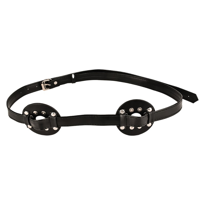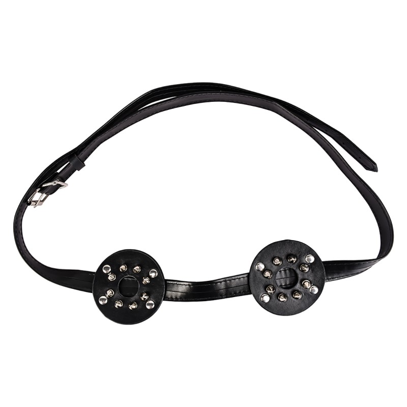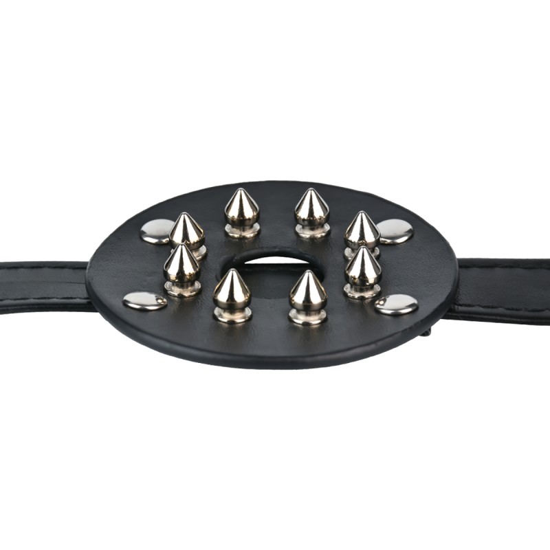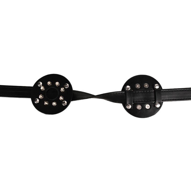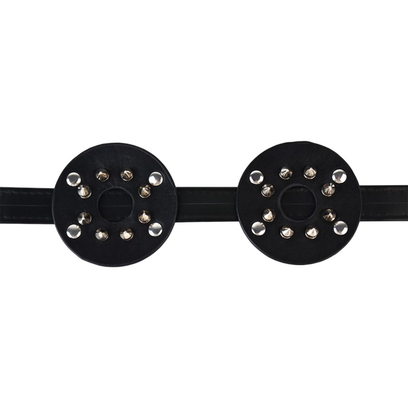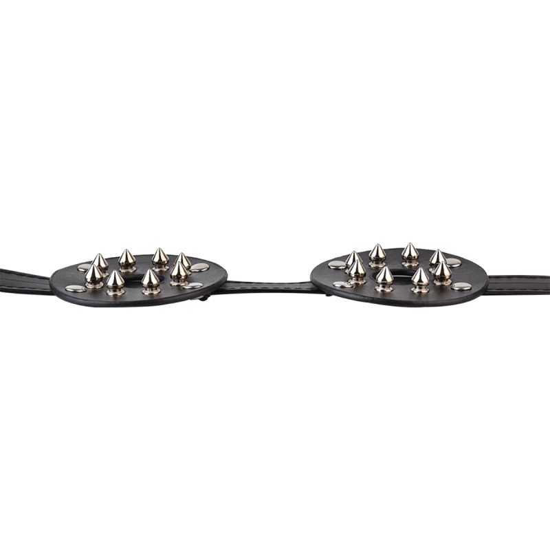 De binder bestaat uit twee ronde PU-leren platen (6,7 cm diameter), een 2 cm brede verstelbare band en een metalen gesp aan de achterkant. De totale lengte van de band is 120 cm en past op borstomtrekken van 76 tot 116 cm. De metalen spikes zijn stevig bevestigd in een cirkelvormige opstelling rond het open midden, zonder direct contact met de tepel – ideaal voor gecontroleerde stimulatie.