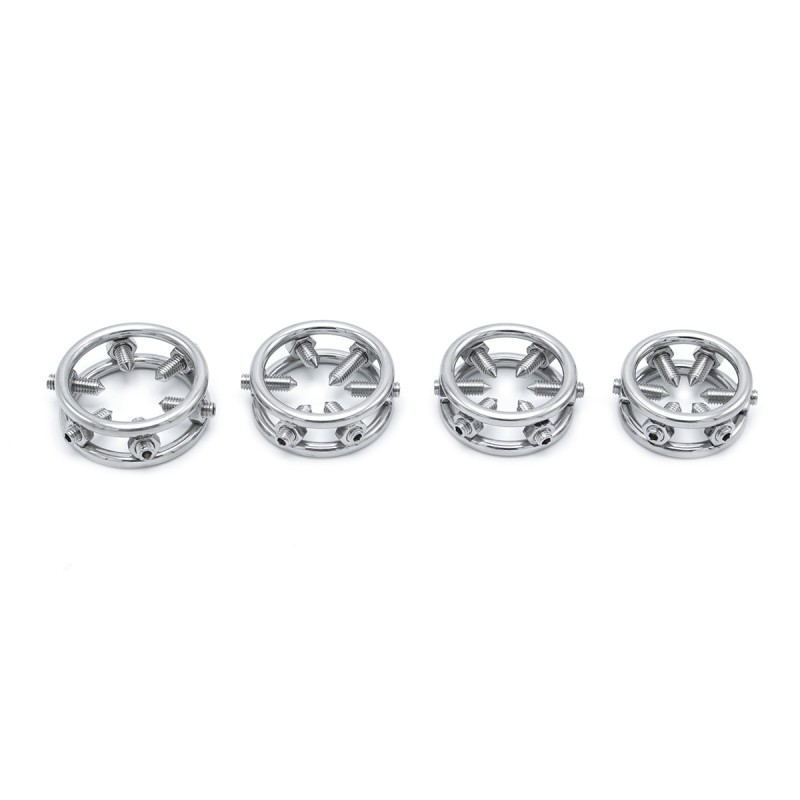 Deze stalen glanspenisring is ontworpen voor degenen die op zoek zijn naar intense sensaties en is niet geschikt voor de delicate zielen onder ons. De binnenkant van de ring bevat 6 verstelbare spikes. Met de meegeleverde inbussleutel draai je de spikes naar buiten (tegen de klok in) om de ring over de eikel te plaatsen, en daarna draai je ze naar binnen (met de klok mee) om de druk aan te passen naar jouw gewenste intensiteit. De ring heeft een binnendiameter van 3,4 cm, een lengte van 4,2 cm en een dikte van 1,6 cm. Deze spiked glans cockring van Kiotos is gemaakt van hoogglans roestvrij staal, wat zorgt voor duurzaamheid en een strak uiterlijk.