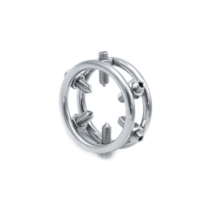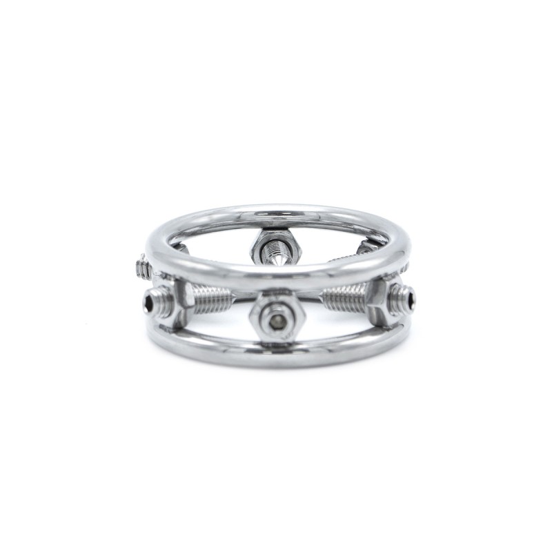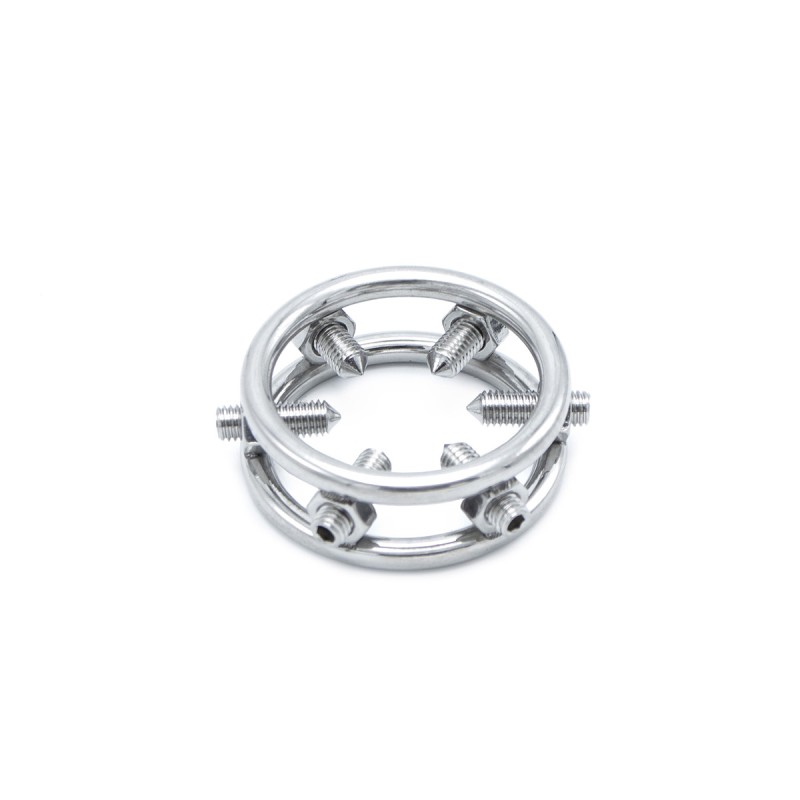 Deze stalen glanspenisring is ontworpen voor degenen die houden van intense sensaties en is niet geschikt voor de gevoelige zielen onder ons. Aan de binnenkant van de ring bevinden zich 6 verstelbare spikes. Met de meegeleverde inbussleutel draai je de spikes naar buiten (tegen de klok in) om de ring over de eikel te plaatsen, waarna je ze naar binnen draait (met de klok mee) om de druk aan te passen naar jouw gewenste intensiteit. De ring heeft een binnendiameter van 3,2 cm, een lengte van 4 cm en een dikte van 1,6 cm. Deze spiked glans cockring van Kiotos is gemaakt van hoogglans roestvrij staal, wat zorgt voor duurzaamheid en een strak uiterlijk.