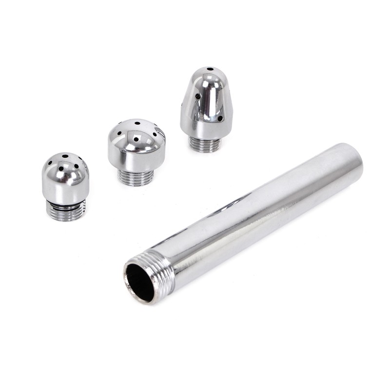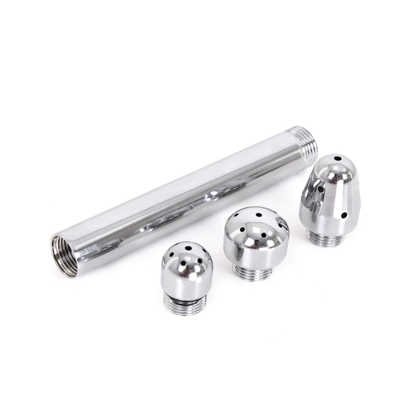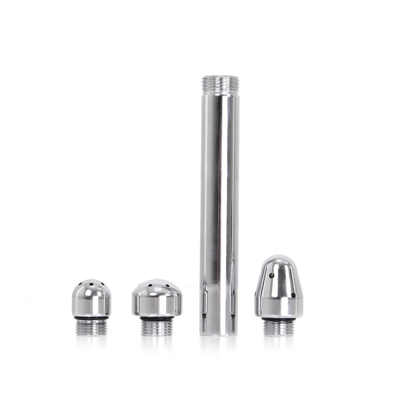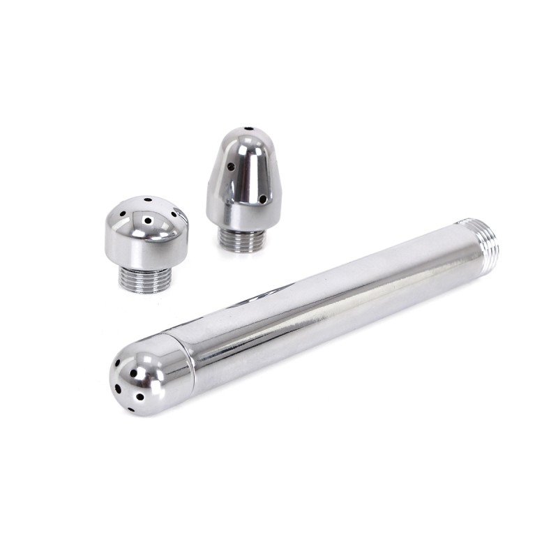 Deze stijlvolle, zilverkleurige anale douche is ontworpen met 7 spuitgaatjes aan de bovenkant van de verwisselbare koppen, wat zorgt voor optimale reiniging en stimulatie. De aansluiting past op alle standaard doucheslangen, waardoor hij gemakkelijk in gebruik is. Gemaakt van hoogwaardig aluminium, is deze douche duurzaam en netjes afgewerkt voor langdurig gebruik.