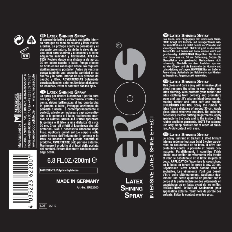 Zijn uw latex kledingstukken hun glans verloren? De unieke verzorgende formule van Latex Shining Spray met intensief glanseffect zal de glans op uw kleding herstellen. Sexy, verleidelijk en foutloos. Latex Shining Spray van EROS is ook een ideaal aankleedhulpmiddel voor nauwsluitende rubber- en latexkleding - zelfs veel lichaamshaar doet geen afbreuk aan het effect. Je erotische kleding zal zacht en soepel zijn en perfect aansluiten op je lichaamsvorm. Ervaar je lichaam op een geheel nieuwe manier!