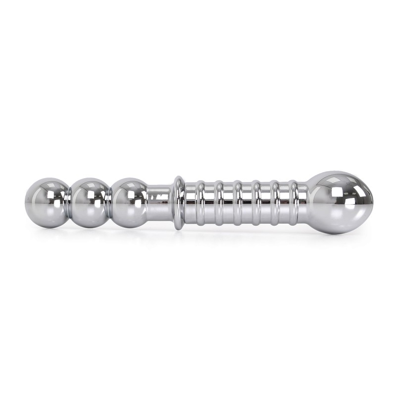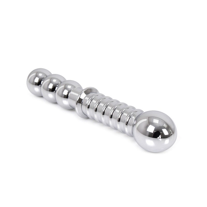 Deze ruige maar elegante geribbelde stalen dildo biedt dubbelzijdig genot. Aan de ene kant bevinden zich 3 afgeronde balletjes, terwijl de andere kant een grote bal heeft gevolgd door een geribbelde schacht. Ideaal voor ongelooflijke sensaties, zowel vaginaal als anaal.