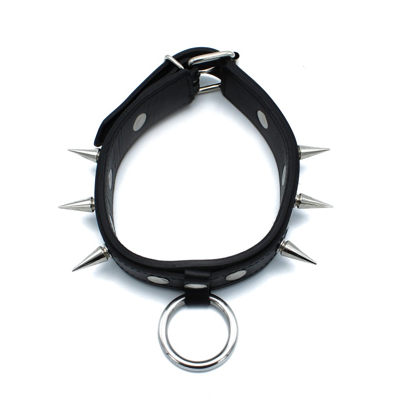 - Materiaal: Zwart leer met metalen spikes en O-ring