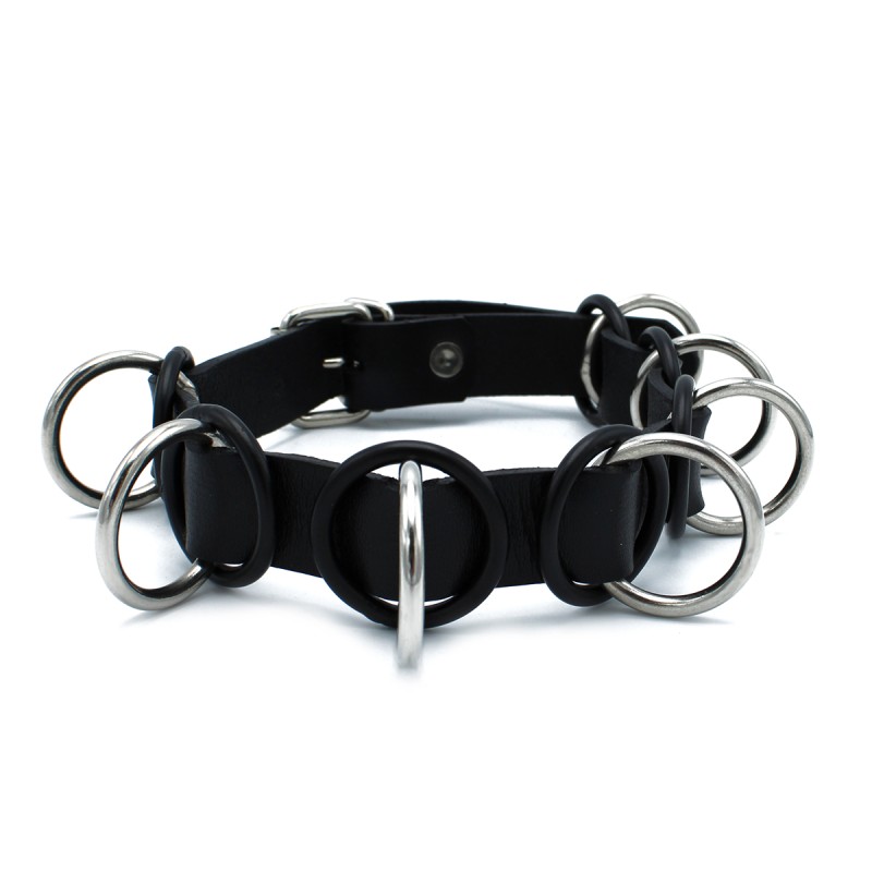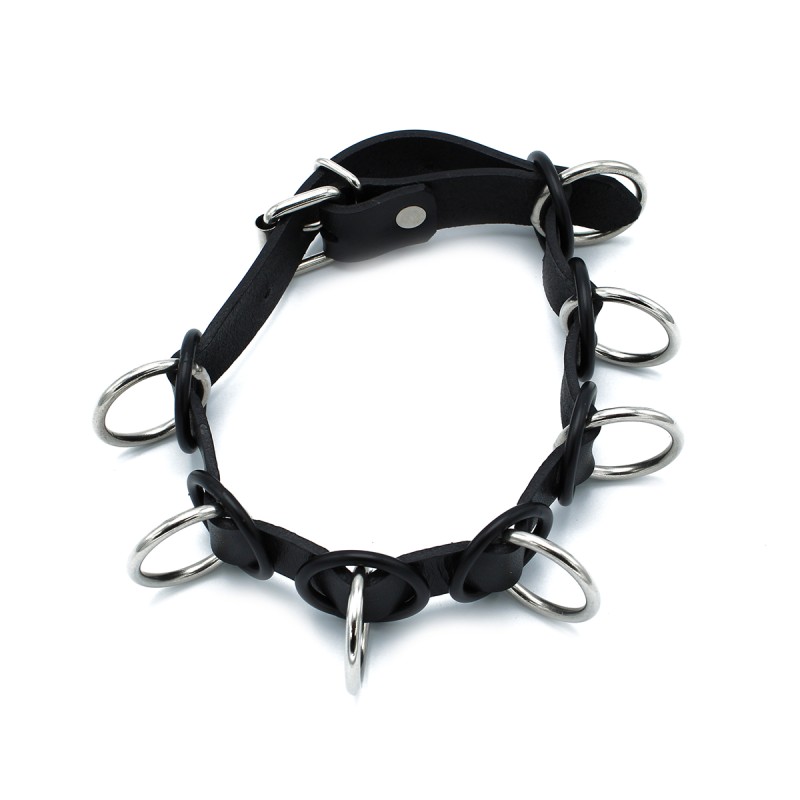 De Zwarte Leren halsband met 7 Statement Ringen is een opvallend accessoire dat een sterke indruk maakt. Gemaakt van stevig zwart leer, beschikt deze halsband over zeven metalen ringen die gelijkmatig over de lengte zijn verdeeld, wat zowel een gedurfde uitstraling als praktische functionaliteit biedt voor het bevestigen van accessoires of fixaties.