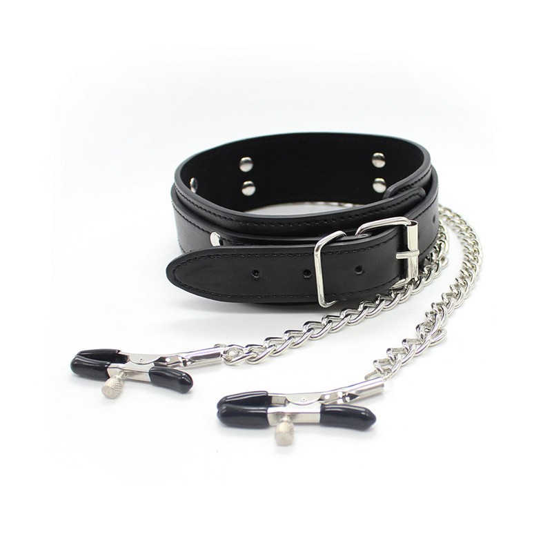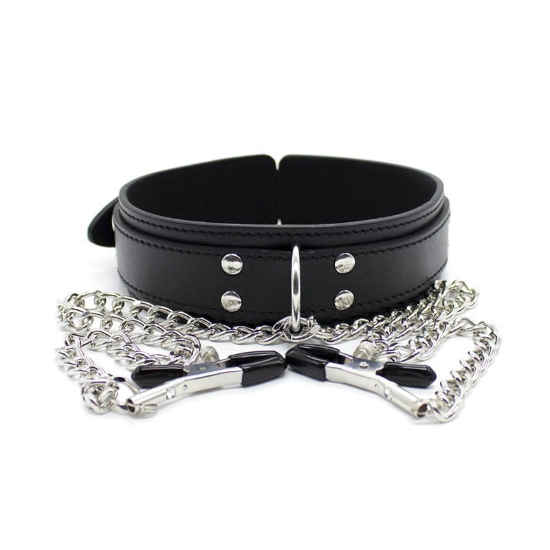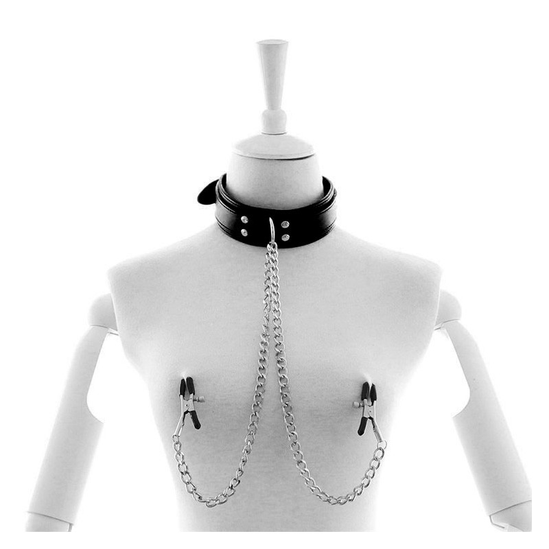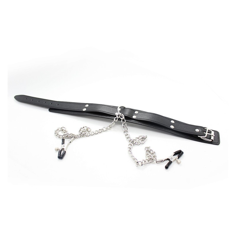 Laat de combinatie van halsband en tepelklemmen je rollenspel verrijken met een verfijnde toets van controle en sensatie.