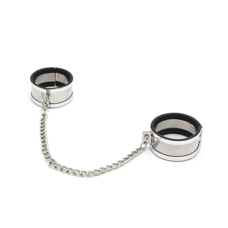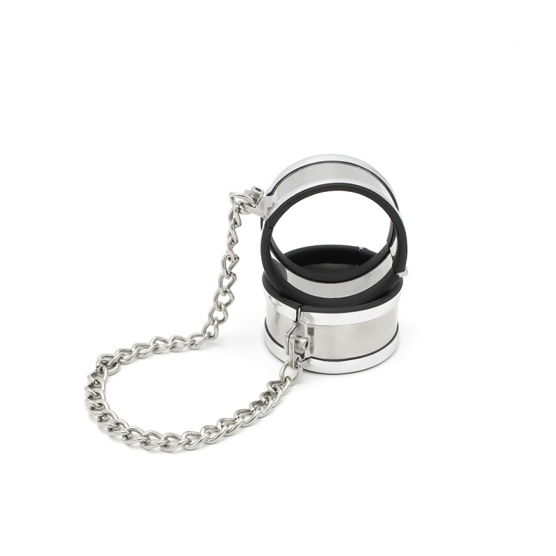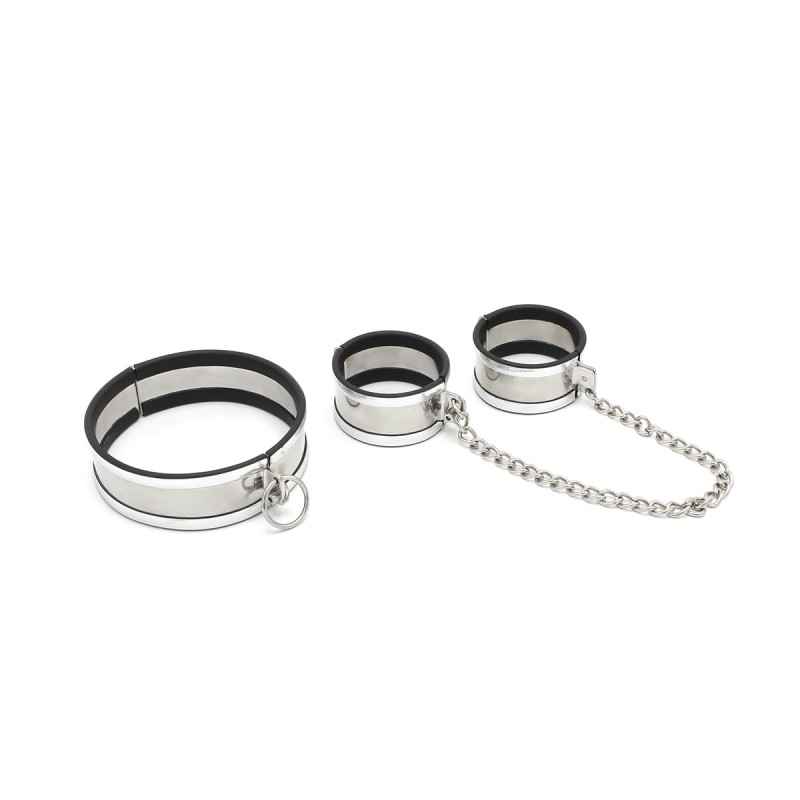 Deze boeien- en halsbandset is vakkundig vervaardigd uit roestvrij staal, wat duurzaamheid en elegantie biedt voor vastbindspelletjes. De set bevat een middelgrote halsband met een diameter van 11 cm, compleet met een paar handboeien, verbonden door een ketting van 35 cm. Elke handboei heeft een diameter van 6 cm, wat zorgt voor een comfortabele pasvorm.