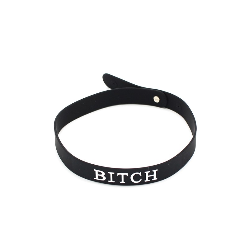 Deze eenvoudige siliconen halsband biedt een luxe ervaring met zijn gladde, zijdezachte materiaal, voor zowel comfort als stijl. De halsband is voorzien van het opvallende naamplaatje "BITCH" in grote witte letters, perfect voor speelse avonturen. Gemaakt van hoogwaardig siliconen van het merk Kiotos X, duurzaam en comfortabel voor langdurig gebruik.