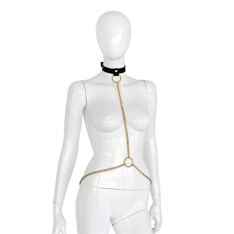 Mysterieus en Dominant: Deze luxe halsband heeft een gestroomlijnde zwart lederen constructie, die een sfeer van mysterie en dominantie uitstraalt. De zwarte tint voegt een vleugje intensiteit toe en creëert een opvallend contrast met de glinsterende gouden kettingen. Het is een symbool van macht en controle, perfect voor diegenen die een gedurfd statement willen maken in hun BDSM-ontmoetingen.