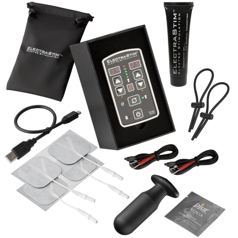 Maak kennis met dual-channel stimulatie met de ElectraStim Flick Duo Multipack. Niet alleen krijg je de geweldige dual-channel ElectraStim Flick Duo Stimulator, je ontvangt ook onze bestverkochte Silicone Noir Aura probe (geschikt voor vaginaal en anaal gebruik), een paar ElectraLoops cockrings, 4 zelfklevende ElectraPads en een tube elektroggeleidende gel.