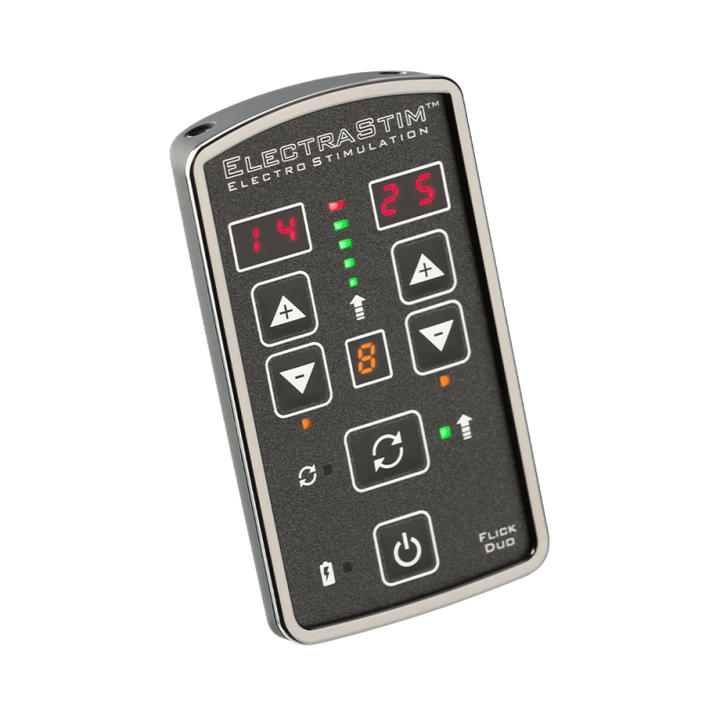 De EM80 ElectraStim Flick Duo was een van onze eerste dual-channel oplaadbare stimulators. Het is de ideale oplossing voor koppels die meer gevarieerd elektrospel willen ervaren en kan twee keer zoveel elektroden aandrijven als onze enkel-kanaal stimulators.