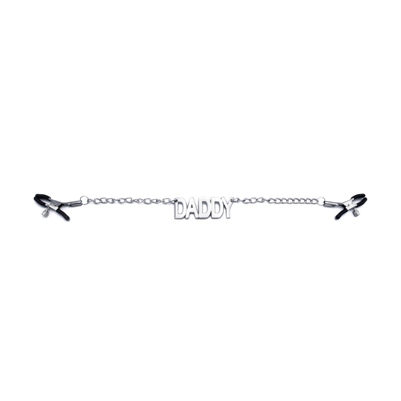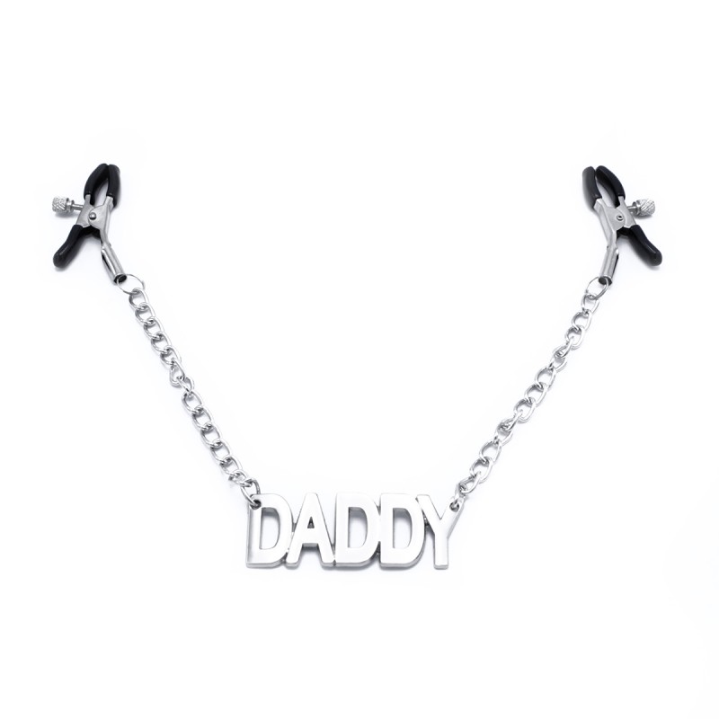 Merk je partner met dit unieke naamlabel dat aan de tepels hangt! Deze knijper-stijl tepelklemmen zijn voorzien van een kleine ketting met het label "DADDY." De klemmen hebben vinyl gecoate uiteinden voor een zachte en comfortabele grip, en de verstelbare schroefring stelt je in staat om de druk per tepel aan te passen, waardoor ze ideaal zijn voor zowel beginners als ervaren gebruikers.