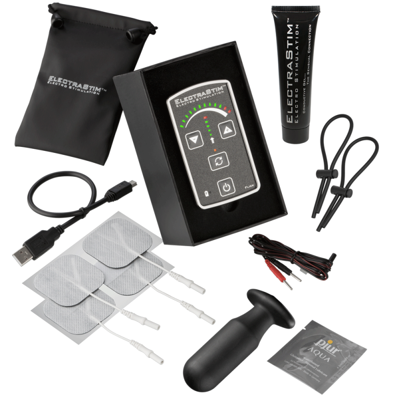 Het ElectraStim Flick Stimulator Multi-Pack - EM60-M bevat 3 accessoires, een ElectraStim Flick stimulator met één kanaal, een Aura Silicone sonde, een aantal geleidende pads en alle benodigde draden en een oplader om meteen te kunnen spelen.