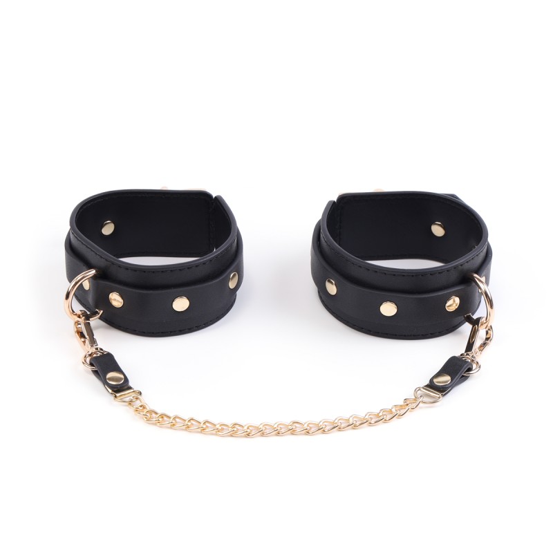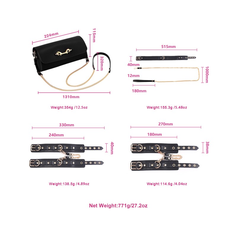 De kraag is verstelbaar en zorgt voor een comfortabele pasvorm voor verschillende nekmaten, terwijl de ketting een element van controle en terughoudendheid toevoegt, waardoor een opwindende krachtdynamiek tussen jou en je partner ontstaat. De handboeien en enkelboeien zijn voorzien van veilige vergrendelingsmechanismen, die een stevige en beperkende houvast bieden die sensaties verhoogt en genot intensiveert.