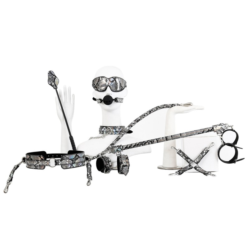De Kiotos BDSM Kit Reptile Neon is een premium set BDSM-accessoires die is ontworpen voor degenen die graag hun kinky kant ontdekken. Deze hoogwaardige set bevat tien items, elk bedekt met hoogwaardig veganistisch imitatieleer met een neonzilver glanzende coating en reptielenpatronen.