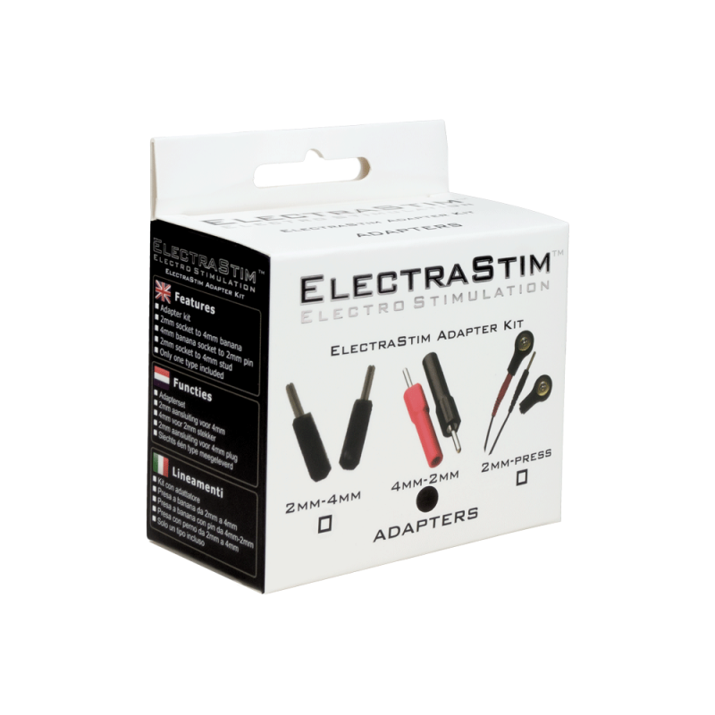 Gebruik deze 4mm naar 2mm e-stim adapterkit wanneer je een ander merk stimulator wilt aansluiten op een ElectraStim seksspeeltje. Sommige andere merken e-stim stimulators hebben 4mm banaan of rechte pluggen aan het einde van hun kabels in plaats van onze standaard 2mm. Gebruik deze adapters om die kabel aan te passen naar een kabel die werkt met onze accessoires.