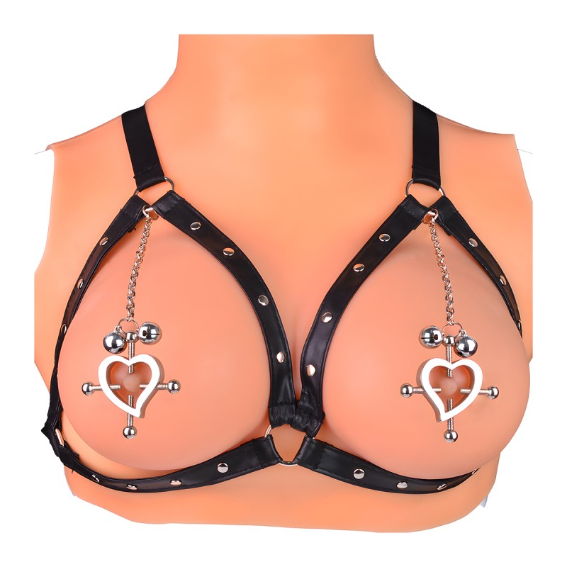 - Kenmerken: Hartvormige klemmen met belletjes, gestud PU-leer harnas met open-bh ontwerp
