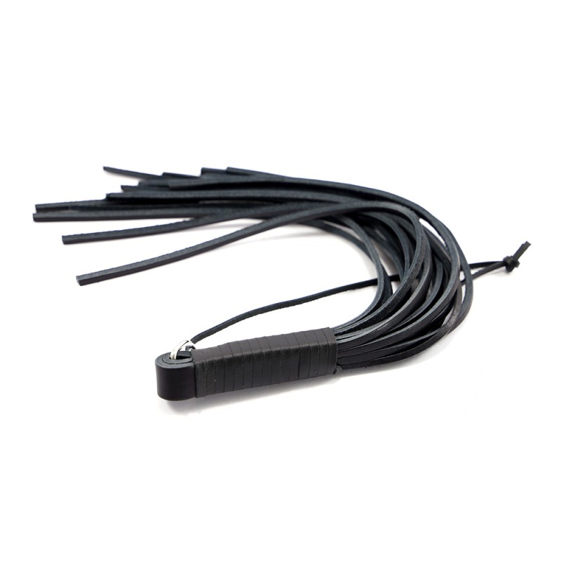 Zweep gemaakt van ongeveer 3,8 mm dik leer met een met leer omwikkeld handvat en een leren polsband.